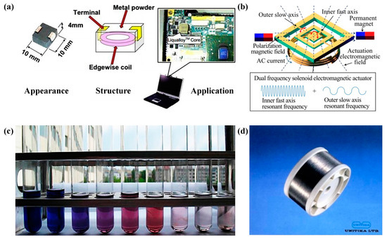 Figure 12 shows some applications cases of Fe-based amorphous alloy. With excellent soft magnetic properties, powder cores made of Fe-based amorphous alloys with higher efficiency and less heat generation are used for power inductors in laptops (please see Figure 12a). Combined with the excellent soft magnetic properties and extremely high fracture strength of Fe-based amorphous alloys, they are applied as torsion bars to help achieve larger scanning angles (please see Figure 12b). In addition to having extremely high fracture strength, Fe-based amorphous alloys have excellent mechanical properties and can be used in a variety of wires (please see Figure 12d) [93]. Fe-based amorphous alloys also have good catalytic performance and can be used for various wastewater purification applications (please see Figure 12c) [98]. It can be seen that Fe-based amorphous alloys have a very wide range of industrial applications and good prospects for development.