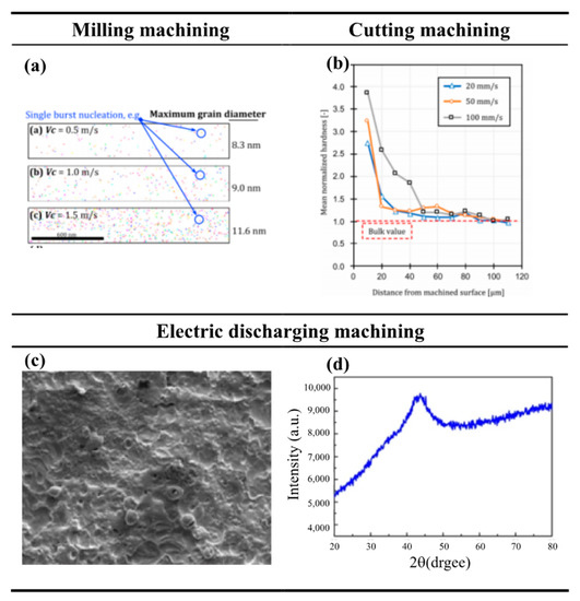(a) The number of nanocrystals increases as the milling speed increases, adapted with permission from Ref. [102]. 2020, Elsevier. (b) Changes in microhardness from the machined surface to the inside of the workpiece after two−dimensional cutting of Fe−Si−B by Fang et al., adapted with permission from Ref. [79]. 2021, Elsevier. (c) The surface after EDM of the Fe−based BMG. (d) The XDR pattern of the Fe−based BMG after EDM [103]. Although there are many pits on the EDM machined surface, the test shows that the Fe-based amorphous alloy does not crystallize.