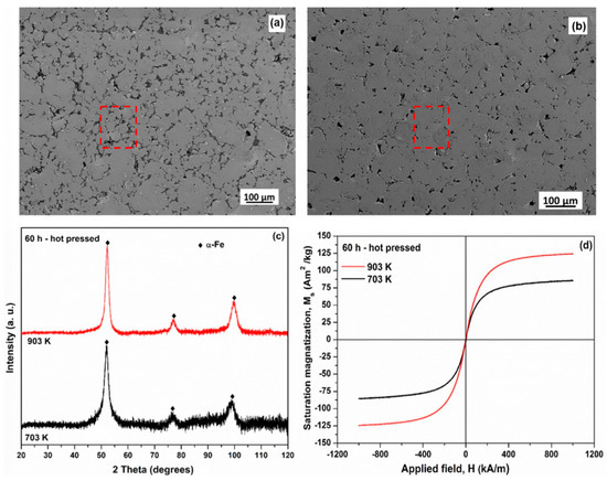 SEM micrographs of the 60−h milled Fe80Nb10B10 metallic glass hot−pressed at (a) 703 K with 880 MPa and (b) 903 K with 640 MPa. The red mark is the crack on the surface of the material after hot pressing. (c) XRD patterns of the 60 h milled samples after hot pressing at 723 K and 903 K. α−Fe is stable at temperatures of 703 K and 903 K. (d) Hysteresis loops for the 60 h milled samples hot-pressed at 723 K and 903 K. The saturation magnetization of the samples hot pressed at 703 and 903 K are 90 and 125 Am2/kg, respectively, reprinted with permission from Ref. [106] 2017, Elsevier.