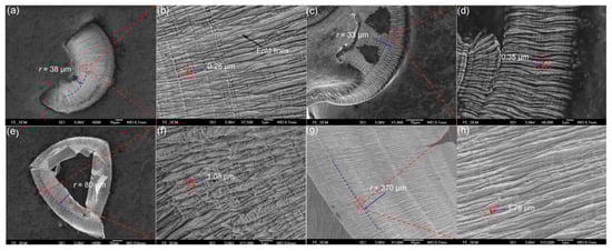Chip morphologies. (a) Overview of chip morphology of sample C. (b) Enlarged morphology of the area enclosed in the red rectangle in (a). A dark arrow points to the fold line. Distance between neighboring fold lines is also marked. (c) Overview of chip morphology of sample A. (d) Enlarged morphology of the area enclosed in the red rectangle in (c). Distance between neighboring fold lines is also marked. (e) Overview of chip morphology of sample B. (f) Enlarged morphology of the area enclosed in the red rectangle in (e). Distance between neighboring fold lines is also marked. (g) Overview of chips’ morphology of sample D. (h) Enlarged morphology of the area enclosed in the red rectangle in (g). Distance between neighboring fold lines is also marked, reprinted with permission from Ref. [109] 2015, Elsevier.