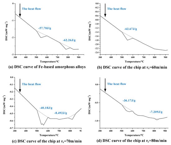 The difficult-to-machine property of Fe-based amorphous alloy limits its application, and study is needed of the suppression methods aimed at the causes of its being difficult to machine. Based on the characteristics of Fe-based amorphous alloys, excessive cutting forces, and high cutting temperatures occur during machining. When the cutting temperature exceeds 352 °C, the amorphous alloy will crystallize, which will have a certain negative impact on the machining process [111]. Wang [100] found that the chips eventually crystallized when cutting Fe-based amorphous alloys using cemented carbide tools. Whether it is the Fe-based amorphous alloy itself or the chips at each cutting speed, there is an obvious reduction in the area of the crystallization exothermic peak, which is a signal of crystallization, indicating that the workpiece is crystallized seriously in the machining, as shown in Figure 16. During the cutting process of Fe-based amorphous alloys, the chip temperature rises sharply along with the increase in cutting speed, the chip microstructure undergoes dynamic crystallization. When the machined surface crystallizes, the properties of Fe-based amorphous alloys change, which undoubtedly leads to instability in the machining process, which negatively affects the machining results. However, there is a special case where the nanocrystals produced during crystallization can enhance the properties of Fe-based amorphous alloys [112]. This nano-crystallization phenomenon may be an effective way to solve the problem of crystallization occurring during the machining of Fe-based amorphous alloys.