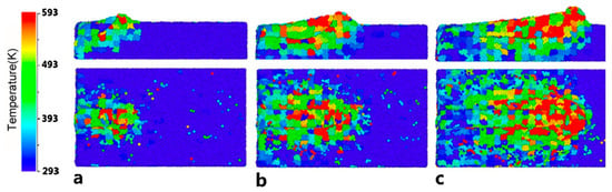 The cutting regional temperature variation diagram of the workpiece during the nanometric cutting process, (a–c) are cross-section views of x–z plane (the first row) and vertical views (the second row), showing the cutting regional temperature variation at cutting distances of 4, 8, and 14 nm, respectively, reprinted with permission from Ref. [48] 2014, Elsevier.