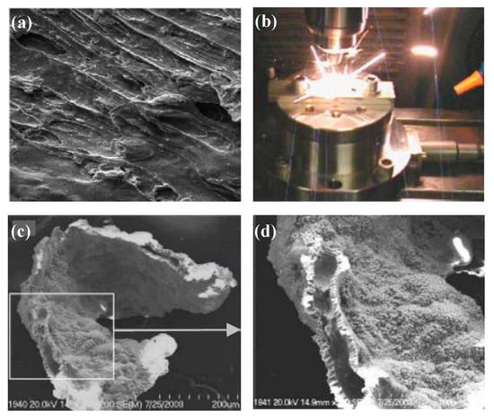 (a) Viscous flow on the surface of the chips produced after Fe−Si−B was cut in two dimensions [100]. (b) Pyro luminescence phenomenon during cutting of Zr-based BMG. (c,d) SEM image of the Zr−based BMG after the pyro luminescence, where severe oxidation and crystallization of the BMG can be observed [114].