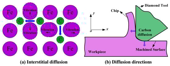 Diffusion process of carbon atoms in cutting ferrous material, reprinted with permission from Ref. [124] 2018, Elsevier. (a) Interstitial diffusion of diamond graphitization. (b) The direction of diffusion of diamond graphitization to the workpiece.