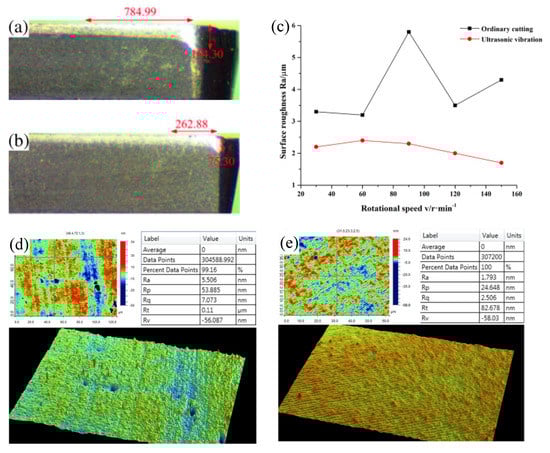 (a) Tool wear diagram under normal cutting. (b) Tool wear diagram under ultrasonic elliptical vibration assistance. The red mark is the main wear amount of the cutting edge. (c) The line graph of the surface roughness under different cutting speeds in ordinary cutting and cutting with the aid of ultrasonic elliptical vibration, adapted with permission from Ref. [127] 2016, Springer. (d) The edge roughness of SPDT single crystal silicon with the aid of ultrasonic vibration. (e) The center roughness of SPDT single crystal silicon with the aid of ultrasonic vibration [130].