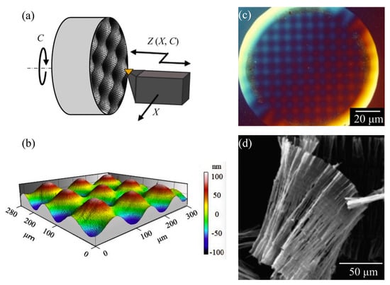 STS is also often applied to assist SPDT machining and have been reported to be quite effective in machining free-form surfaces and geometries [147]. Nagayama and Yan [148] successfully prepared two-dimensional sine wave grids on typical brittle material monocrystalline silicon in a single cut with a shape accuracy of 8 nm PV and surface roughness less than 1 nm Sa using STS-assisted SPDT, as shown in Figure 21a–c. The SEM image of the cutting chips is shown in Figure 21d. Continuous chips were generated during the machining process, indicating that ductile material removal was realized in this study. Therefore, it is a good choice to use STS-assisted SPDT Fe-based amorphous alloys to achieve ductility removal to improve their machining performance.