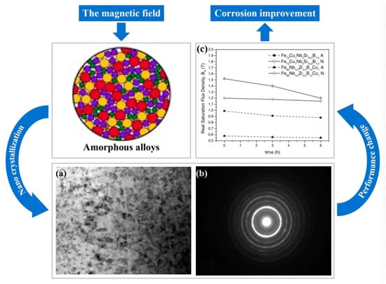 - Zhang, Y.H.; Chao, Y.S. Nano-Crystallization of Amorphous Alloy Fe78Si9B13 by Treatment of Low-Frequency Pulsating Magnetic Field. J. Northeast. Univ. (Nat. Sci.) 2003, 24, 1018–1020. (In Chinese) [Google Scholar]
