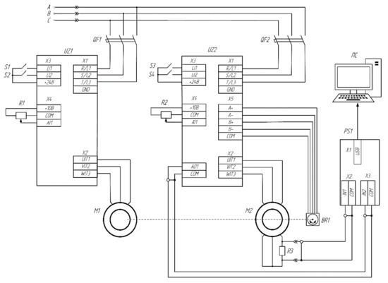The experiments were carried out on a stand (Figure 1) on which two frequency-controlled asynchronous electric drives operated on a common mechanical shaft, testing the parameters of the motor and frequency converters in various operating modes.