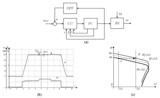 Block diagram of an AED with dynamic coupling by torque (a), transients (b) and mechanical characteristics (c). n1(M) is the initial mechanical characteristic at low load, n2(M) is the mechanical characteristic corrected by DPF at increased voltage on the stator.