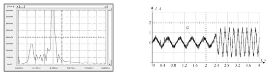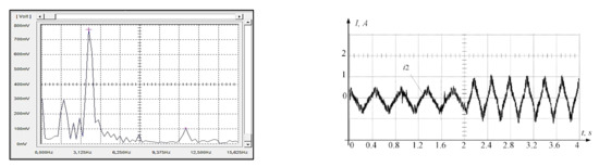 Figure 9, Figure 10 and Figure 11 show diagrams of rotor currents with three control methods. After the end of transient processes, the frequencies of rotary currents are constant and determined quite accurately, as are vector control and dynamic compensation. The frequency of the main harmonic of the rotor current in the drive with DPF (3.5 Hz) is significantly lower than in the drive with a PID speed controller (8.125 Hz). The amplitudes also differ significantly: 1.1 A versus 2 A (Figure 9 and Figure 10).