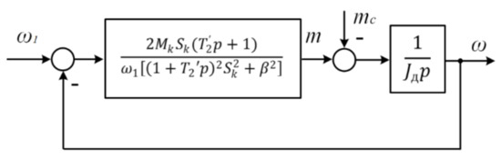 Now, let us consider the transfer functions of the electric motor torque generation channel, determined by the control method and the load. In accordance with the formula, the TF and FC are determined by the critical torque Mk, the critical slip sk and the current slip β determined by the load (Figure 14).