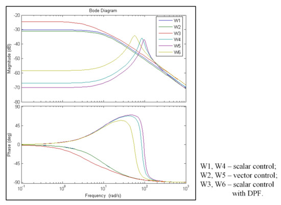 The nonlinear transfer function corresponds to the frequency characteristics family, varying with the same parameters. The identification of drives with IM using these categories is described in detail in a number of articles [14,15,16]. The transfer function (TF) and the frequency characteristics (FC) determine the dependence of the dynamics of asynchronous drives from the frequency of stator voltage and the relative slip, as described in [14].