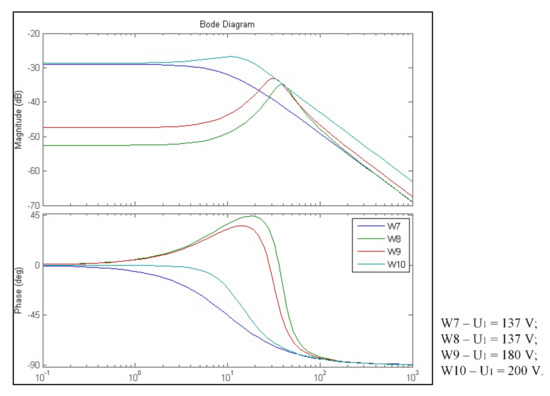 At light load, the frequency response is close to that of the inertial link (W7). With increasing load, the frequency response is distorted and the structure becomes oscillatory (W8, W9). As follows from the frequency characteristics shown in Figure 15, built according to the experimental data given in Table 4, with an increase in the main magnetic flux, the speed of the torque formation circuit, rigidity and stability margin all increase. The drive with the maximum ratio again becomes a link close to the inertia (W10)