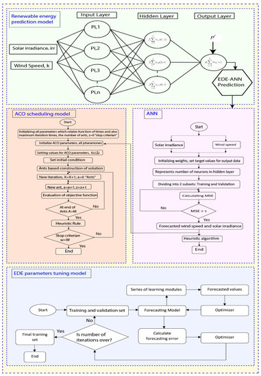 The ANN-EDE model forecasts solar irradiance for accurate energy estimation [87], which is shown in Figure 2. Solar PV system generates electricity from the sun depending upon forecasted solar irradiation, and ambient temperature, defined as follows [88]: