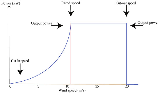 where , A, , and , represent WT energy, turbine blades area, wind speed, and air density, respectively. The relation between electricity generation and wind speed is depicted in Figure 3. The ANN-EDE forecasts wind speed for accurate energy estimation [87], which is shown in Figure 2. The wind energy system speed constraints are modeled in Equations (14)–(16).