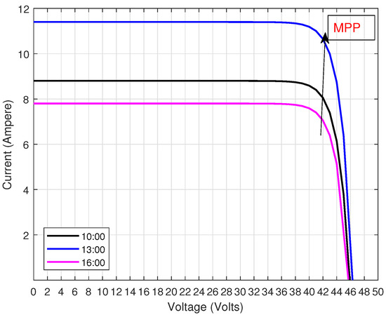 where is electrical energy generation, is area of solar panel, is efficiency of solar panel, is solar irradiance, and is ambient temperature. The i-v curve with Maximum Power Point Tracking (MPPT) is shown in Figure 4 that assures PV cell optimal performance.