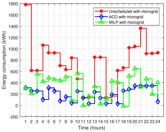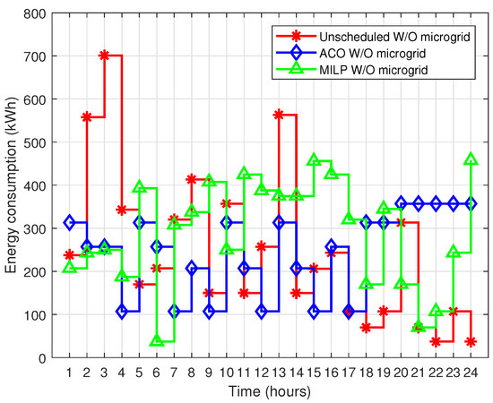 This section discusses the simulation results of developed ACO compared to existing models for power usage scheduling W/O considering the microgrid. Figure 6 shows that the developed algorithm schedules the load during low price hours as per the FPS W/O considering the microgrid. Figure 6 illustrates that energy consumption is maximum without implementing our developed model because energy is purchased and used during high price hours that lead to peaks creation in demand. Numerical results are listed in Table 3.