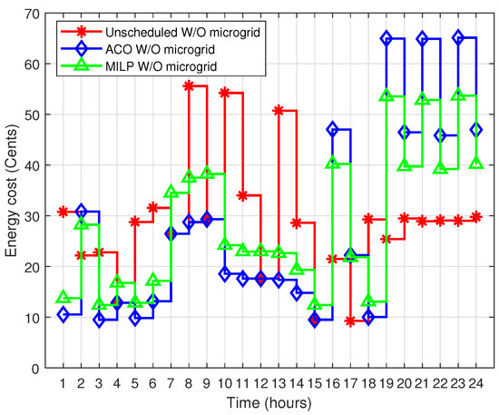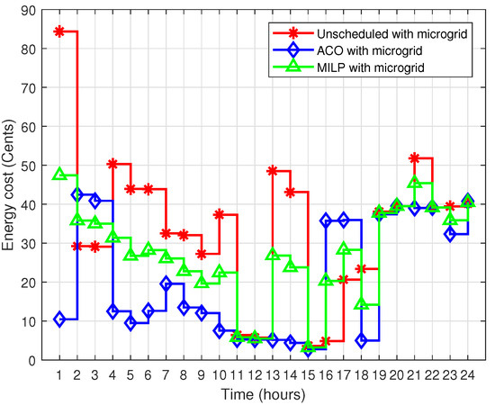 The per hour energy cost profile of the discussed energy consumption is shown in Figure 7. Figure 7 demonstrates that consumers pay the least bill with our proposed model than unscheduled and MILP based scheduling cases. Our developed model optimally schedules appliances during off-peak hours, and eventually, consumers pay the minimum cost and enjoy savings in the utility bill.