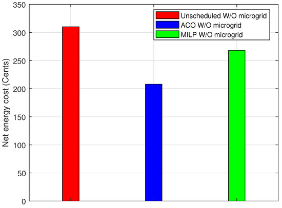 Figure 8 illustrates per day energy cost evaluation of the developed model compared to MILP and W/O scheduling case. It is obvious from the figure that our model reduced a significant cost compared to unscheduled and MILP based cost. Thus, the developed model outperforms existing models in aspects of energy cost minimization, and achieved cost reduction of 23.69%. Numerical results are listed in Table 3.