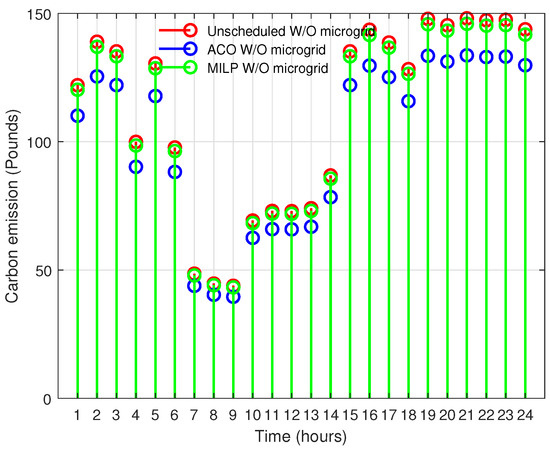 Overall evaluation of the developed ACO algorithm compared to MILP and W/O scheduling case in aspects of carbon emission, energy cost, and PAR.