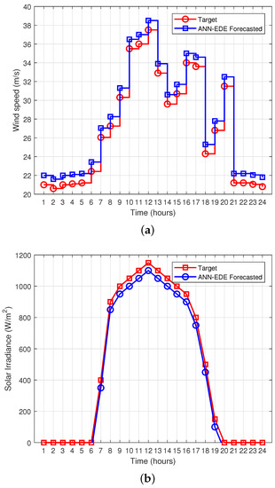 where S represents input signal with selected attributes, parameter determines the steepness of sigmoidal function, and b shows bias value. The ANN forecaster employed multivariate autoregressive rule to learn from history data to predict wind speed and solar irradiance for accurate energy estimation [84]. The prediction model is shown as first block in Figure 2. The history data is adopted from [84]. The history data is divided into training and testing sets of 80% and 20%, respectively. The training set trains the model to forecast solar irradinace and wind speed, and the testing set validates the model by comparing obtained results with ground truth observations. The MAPE error is employed as a performance metric mathematically defined as follows in Equation (2) [84]: