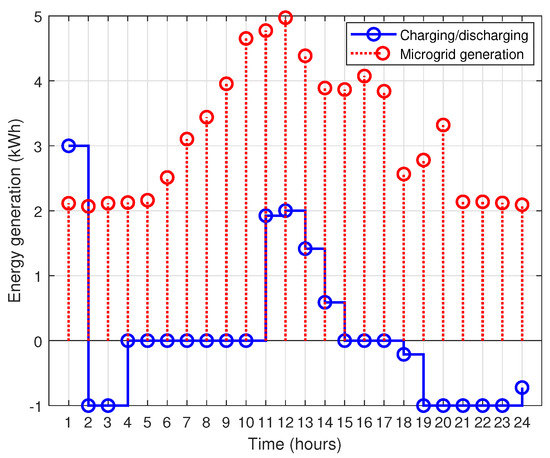 where SE denotes stored energy (Ah) at time duration t, represents ESSs energy efficiency, and represents charging/discharging status per hour modeled in Equation (42).