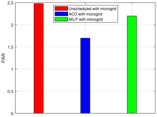 PAR minimization is one of our objectives, which is beneficial for utility grid and consumers because it leads toward cost minimization for both bodies. PAR minimization objective is catered W/O and with microgrid, which is mathematically modeled as follows: