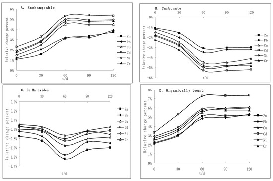Relative changes in heavy metal forms in M. floridulus rhizosphere soil ((A) is the Exchangeable, (B) is the Carbonate, (C) is the Fe-Mn oxide, and (D) is the Organically bound).