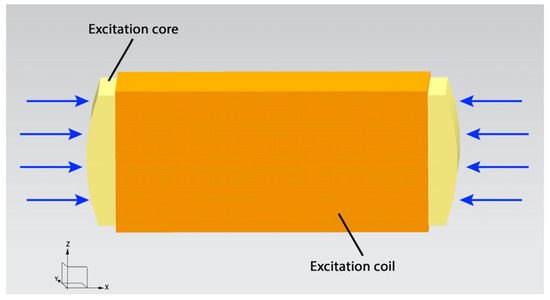 Figure 10 shows the schematic diagram of the magnetic circuit. The magnetomotive force generated by the excitation core includes two parts: the magnetomotive force generated by the vertical coil and the magnetomotive force generated by the horizontal coil. The horizontal coil axis and the induction magnetic pole axis are located on the same plane, and the magnetic flux direction is parallel to the plane. The coil axis in the vertical direction is perpendicular to the axis of the induction magnetic pole, and its magnetic flux direction is perpendicular to the plane where the axis of the induction magnetic pole is located so that the number of turns of the winding coils in the horizontal and vertical directions of the two excitation magnetic cores is n, and the coils in the horizontal and vertical directions of each excitation magnetic core are connected in series, and the two excitation magnetic cores are connected in series: