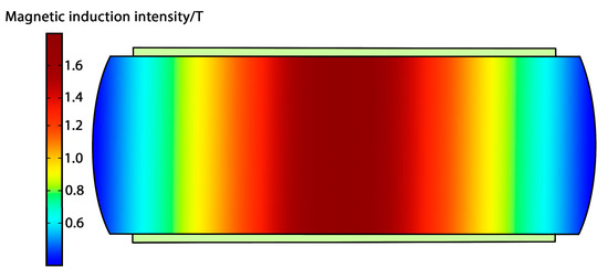 In Ansys software, the parameter in Equations (2) and (3) is defined as: Ms = 1.92 × A/m, λs = 74 × = 200, σs = 55 MPa, μ0 = 4π × T·m/A, E = 76 × Pa [28], the number of turns of the excitation coil is n = 130, the external force is 0 and the coil current is 5A. The magnetic field distribution diagram of the longitudinal section of the prism is obtained by simulation, that is, the simulated magnetic field distribution diagram of the x-z plane, as shown in Figure 3. It can be seen from the figure that the magnetic induction intensity at the center of the iron-cobalt alloy prism is the largest, which can reach 1.4 T, and the magnetic induction intensity gradually decreases from the center to both sides. This is due to the influence of the biased magnetic field generated by the coil. The bias magnetic field in the middle part is larger and the bias magnetic field on both sides is smaller.