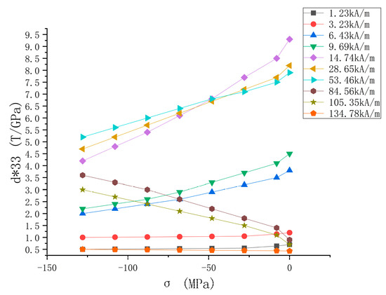 where, B is the magnetic induction intensity in the iron-cobalt alloy; is the piezomagnetic coefficient; σ is the stress; μ is permeability; H is the bias magnetic field strength. The magnetic induction intensity B is affected by the magnetic field and stress with the bias magnetic field intensity H and σ. The piezomagnetic coefficient is also affected by the bias magnetic field H and stress σ.