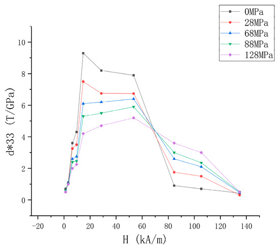 Relationship between piezomagnetic coefficient and compressive stress under different bias magnetic fields.