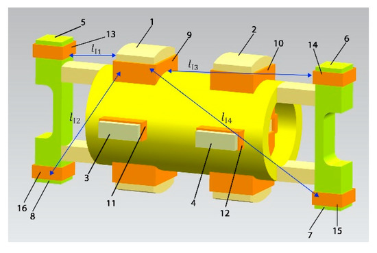 Structure diagram of piezomagnetic sensor. 1. Vertical excitation core I; 2. Vertical excitation core II; 3. Horizontal excitation core I; 4. Horizontal excitation core II; 5. Induction core 1; 6. Induction core 3; 7. Induction core 4; 8. Induction core 2; 9, 10, 11, 12. Excitation coil; 13, 16, 14, 15. Induction coil1, 2, 3, 4.