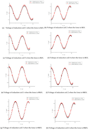 Voltage of each induction coil of piezoelectric magnetic sensor under different external forces. (a) Voltage of induction coil 1 when the force is 0 kN, (b) Voltage of induction coil 2 when the force is 0 kN, (c) Voltage of induction coil 3 when the force is 0 kN, (d) Voltage of induction coil 4 when the force is 0 kN, (e) Voltage of induction coil 1 when the force is 80 kN, (f) Voltage of induction coil 2 when the force is 80 kN, (g) Voltage of induction coil 3 when the force is 80 kN, (h) Voltage of induction coil 4 when the force is 80 kN.