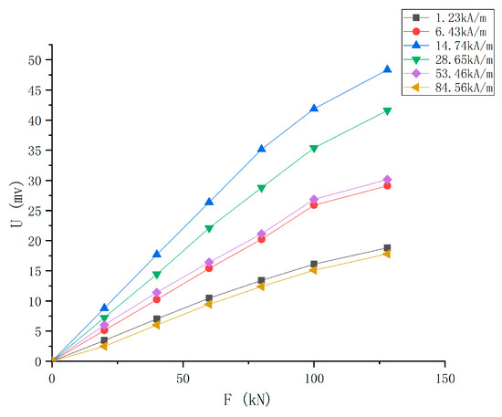 After the DC power supply is connected, the relationship between the sensor output voltage and force under different bias magnetic fields is tested by changing the current to change the bias magnetic field, as shown in Figure 15. The sensor sensitivity is obtained by deriving the points in Figure 15. When the bias magnetic field is 1.23 kA/m and 84.56 kA/m, the change rate of voltage is small and the sensitivity is small. It can be seen from Figure 15 that when the magnetic field is 1.23 kA/m and 84.56 kA/m, the piezomagnetic coefficient of the iron-cobalt alloy is low, resulting in a small change rate of voltage. Experiments show that under the bias magnetic field of 14.74 kA/m, the piezomagnetic coefficient is the largest and the maximum sensitivity is 0.4394 mV/kN, which is consistent with the simulation results of iron-cobalt alloy in Section 2.