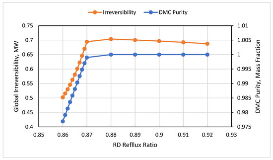 The results of the global irreversibility and DMC purity for different values of the RD reflux ratio are shown in Figure 3, where it is noticed that both parameters increased as the reflux ratio increased. The two curves showed gradual increases until reaching the critical points, which were at the optimal reflux ratio (0.87), as presented in Table 4. An important indication from this behavior is related to the quality of the 0.87 optimized reflux ratio; so, improvements should not move away from this optimal value depending on the required level of purity. Lowering the irreversibility is associated with keeping the chemical reaction thermodynamically closer to equilibrium; however, the production of DMC still requires shifting the reaction toward the DMC side, which is a source of irreversibility. Since the DMC reaction is exothermic [13,14], carrying out the reaction at higher temperatures could lower the irreversibility, although, conventionally, the exothermic reaction should be controlled by cooling to reduce the temperature [11]. On the other hand, the duties of the RD reboiler and condenser were constant and not affected by the change in the RD reflux ratio.