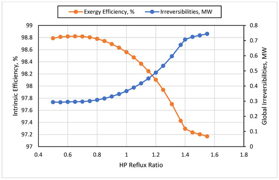 Figure 4. Effect of the HP Reflux Ratio on the Global Irreversibilities and Intrinsic Efficiency.