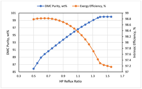 Figure 5. Effect of the HP Reflux Ratio on the DMC Purity and Intrinsic Efficiency.
