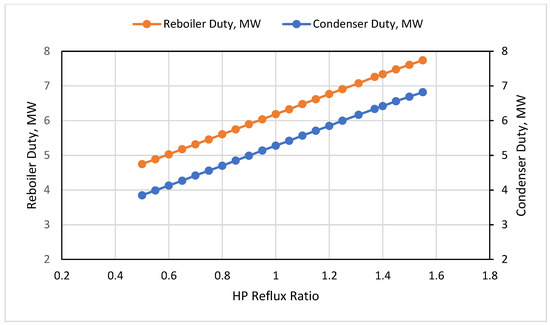 Figure 6. Effect of the HP Reflux Ratio on the Reboiler Duty and Condenser Duty.