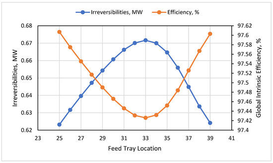 Figure 10. Effect of the Feed Tray Location on the Irreversibilities and Intrinsic Efficiency.