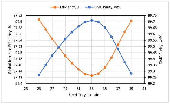 Figure 11. Feed Tray Location Versus Global Intrinsic Efficiency and DMC Purity.
