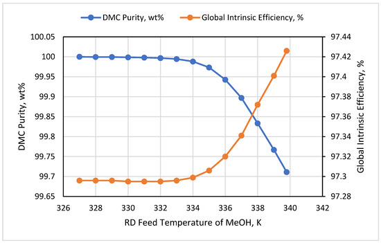 Figure 12. Effect of the RD Feed Temperature of MeOH on the DMC Purity and Global Intrinsic Efficiency.