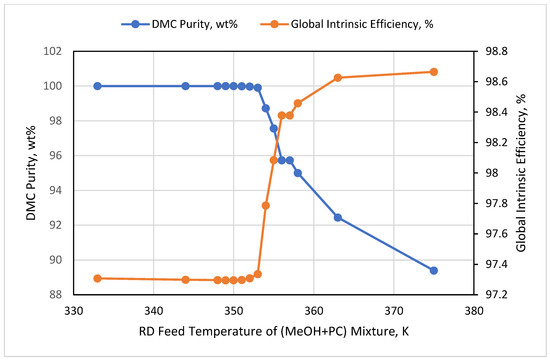 Figure 13. Effect of the RD Feed Temperature of the MeOH+PC Mixture on the DMC Purity and the Global Intrinsic Efficiency.