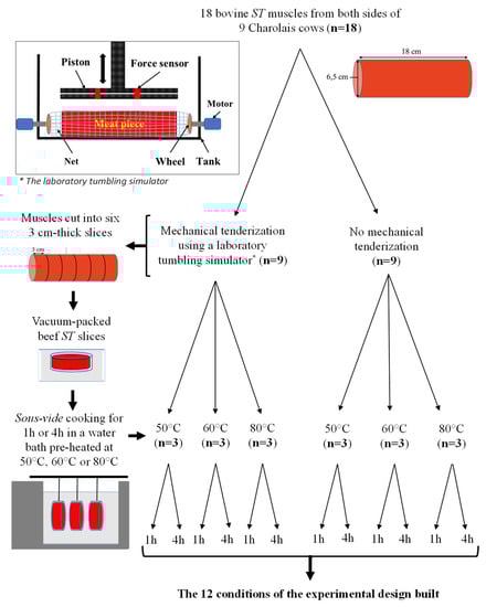 In the end, the procedure implemented corresponded to a full factorial design with three factors, namely the cooking temperature with three levels (50 °C, 60 °C and 80 °C), the cooking time with two levels (1 h and 4 h) and the mechanical treatment with two levels (applied or not). In summary, each of the twelve conditions of this full experimental design was finally associated with nine 3 cm thick slices of ST muscles from three different animals (Figure 1).
