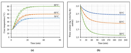 Simulation of (a) core temperature kinetics with heat conduction using Fourier’s law, the material properties reported in [28], and piecewise linear interpolation to our temperatures of ‘non-stirred water bath’ heat transfer coefficients taken from Kondjoyan et al. [48], and (b) time-course of average water content based on the mass transfer relation and its parameters taken from Kondjoyan et al. [48] for a sous-vide-packed, 3 cm thick, 6.5 cm diameter slice of meat immersed in a water bath at temperatures of 50 °C (blue), 60 °C (orange) and 80 °C (green). Dashed lines are the upper and lower bounds of the estimation based on the propagation of uncertainties from the material properties and the boundary heat transfer coefficient.