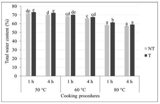 Total water content (TWC) values measured on bovine Semitendinosus muscle samples previously tumbled (T) or not (NT, used as control) and then sous-vide cooked at 50 °C, 60 °C or 80 °C for 1 h or 4 h. The data correspond to mean values ± standard error (SE) calculated from 18 individual samples prepared from three different ST muscles. Different letters (a–e) refer to significant differences between all treatments.