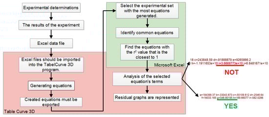 Table Curve 3D (V4, Systat Software Inc., London, UK Branch, 2019) software was used to construct mathematical equations that corresponded to the results. Table Curve 3D is a program that can generate various sorts of response surfaces. These surfaces correspond to the 450 million equations in the program database [44].