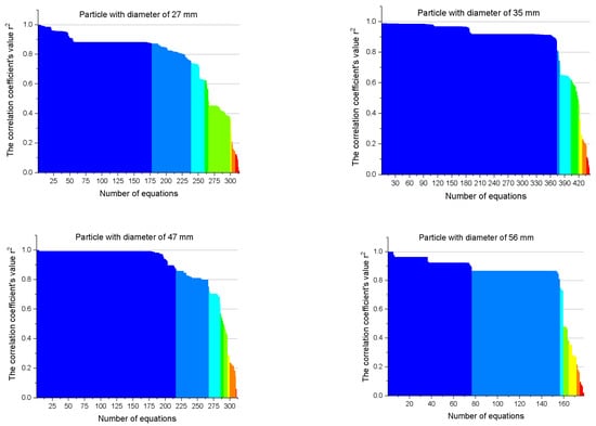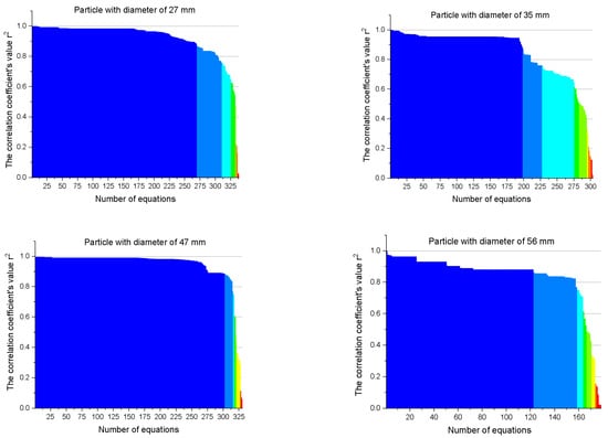 - A maximum of 205 equations corresponding to r2 variation in the range 1–0.9 and a minimum of 0 equations corresponding to r2 variation in the range 0.3–0.4 were discovered for the particle with a diameter of 47 mm;