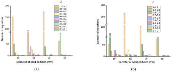 - A total of 81 equations for r2 in the range 0.8–0.9 were developed for the particle with a diameter of 56 mm, which indicates the interval with the most equations. For r2 between 0.6–0.7 and 0.5–0.6, no equations are generated in the intervals.