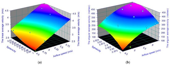 The response surfaces corresponding to the selected equation [44] are shown as follows: (a) for the average instantaneous velocity of a particle with dimensions of 47 mm; (b) for the average angular velocity of a particle with a diameter of 27 mm.